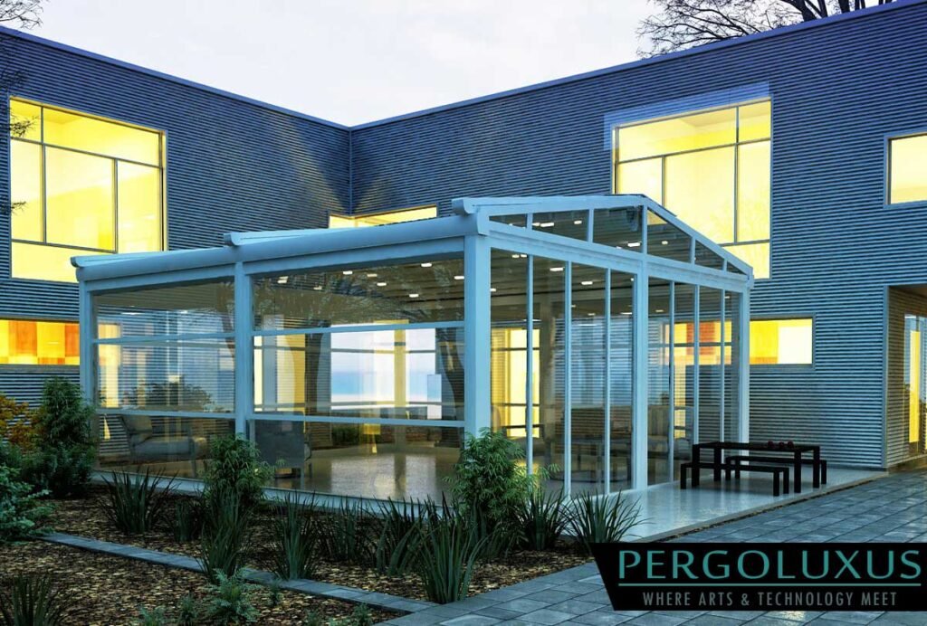 The special integration between horizontal PVC fabric and aluminum profiles provides increased strength and allows the system to move on the rails smoothly powered by automatic controlled motors . All pergola systems of PERGOLUXUS can be customized for application in areas of different sizes, and single-module and multi-module solutions are available with project-specific supporting products and endless color alternatives.